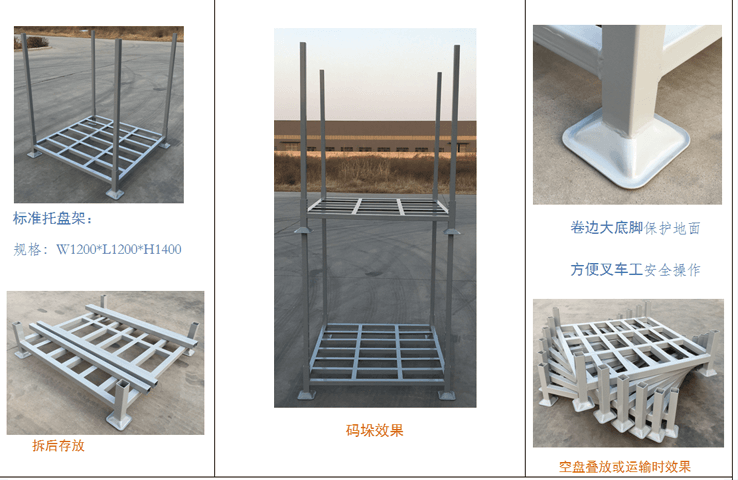 40A型托盤架 產品介紹:本產品主要優點是與叉車配合實用,可充分利用倉庫高度空間。降低倉儲費用,管理和經營費用。主要用于軟袋子包裝和紙箱包裝物品存放 和顆粒物品存放防止積壓,常用于冷鏈、飼料、塑料顆粒倉儲及物流。