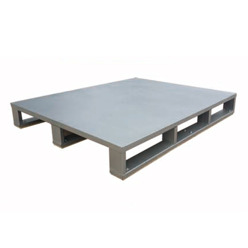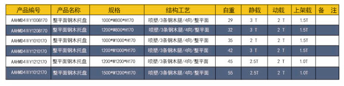 四向三腿——整平面鋼木托盤 技術參數說明: 產品編號:AAHMD4ⅢY1512170 產品規格: 1500*1200*170 防銹工藝: 靜電銀粉沙紋噴塑 產品靜載: 2000KG(均勻載重) 產品動載: 2000KG(均勻載重) 產品上架: 1500KG(均勻載重) 主要用途: 倉庫、車間周轉、高庫物流及倉儲